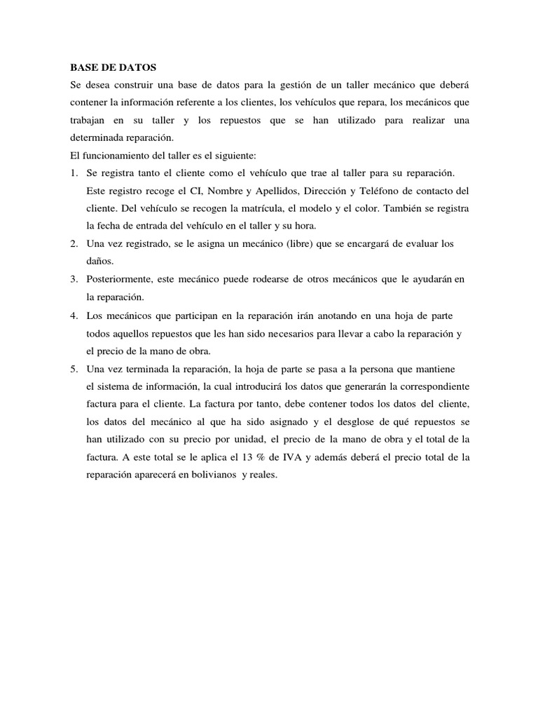 Se desea construir una base de datos para la gestión de un taller mecánico que deberá