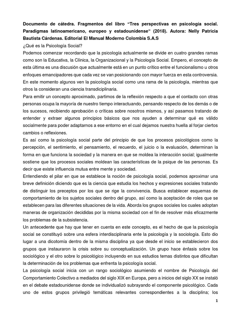 Documento de cátedra. Fragmentos del libro “Tres perspectivas en psicología social.