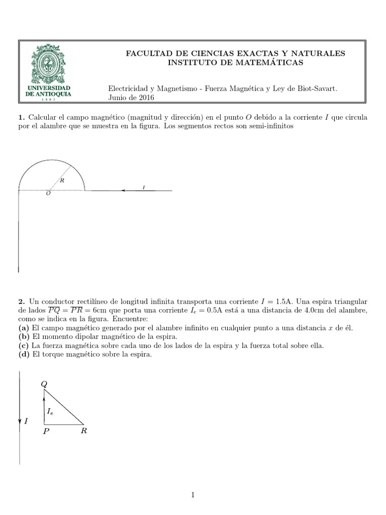 1. Calcular el campo magnético (magnitud y dirección) en el punto O debido a la corriente I que circula