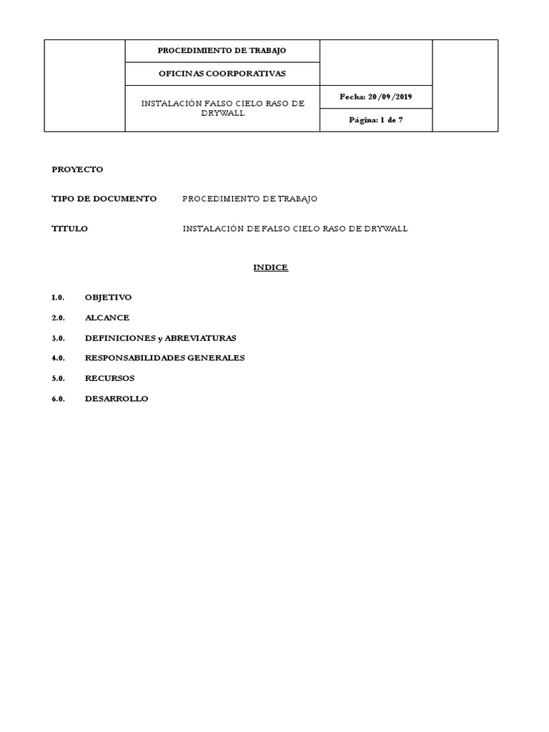 Este procedimiento es aplicable para los trabajos de Falso Cielo Raso de Drywall, a ejecutarse en el proyecto