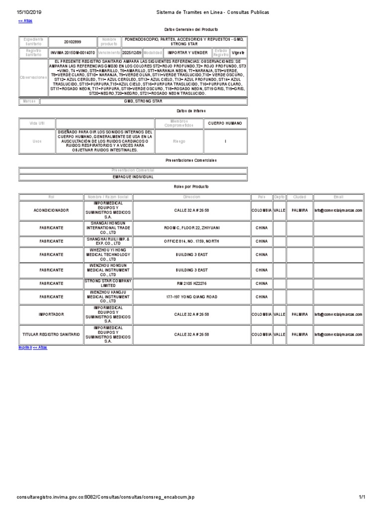 TITULAR REGISTRO SANITARIO CALLE 32 A # 26 58 COLOMBIA VALLE PALMIRA info@[Link]