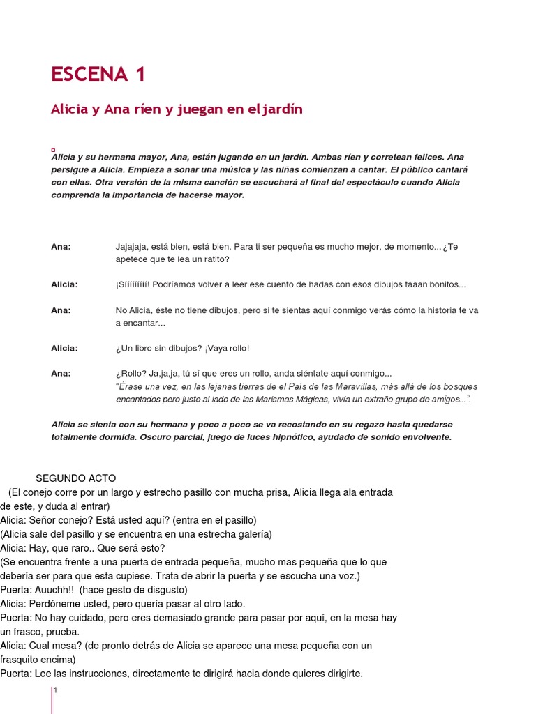 Alicia: (Al público) ¡Vaya líos! Desde que he llegado aquí todo es muy raro, no es malo, ni