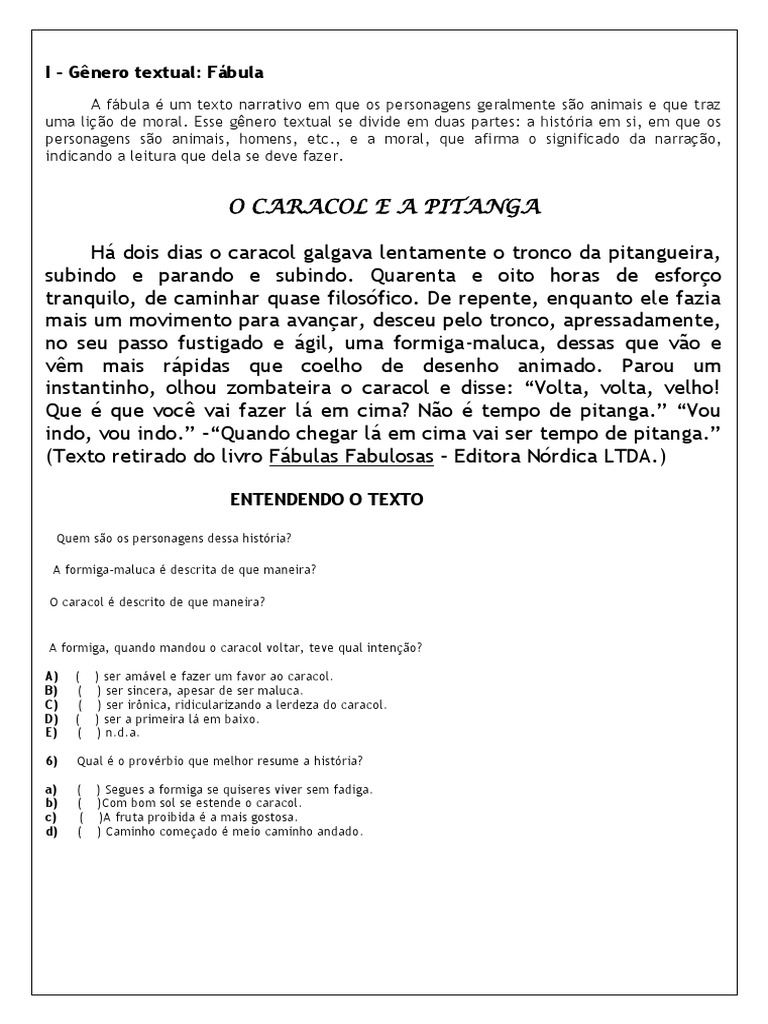 moral. Esse gênero textual se divide em duas partes: a história em si, em que os personagens são animais, homens,