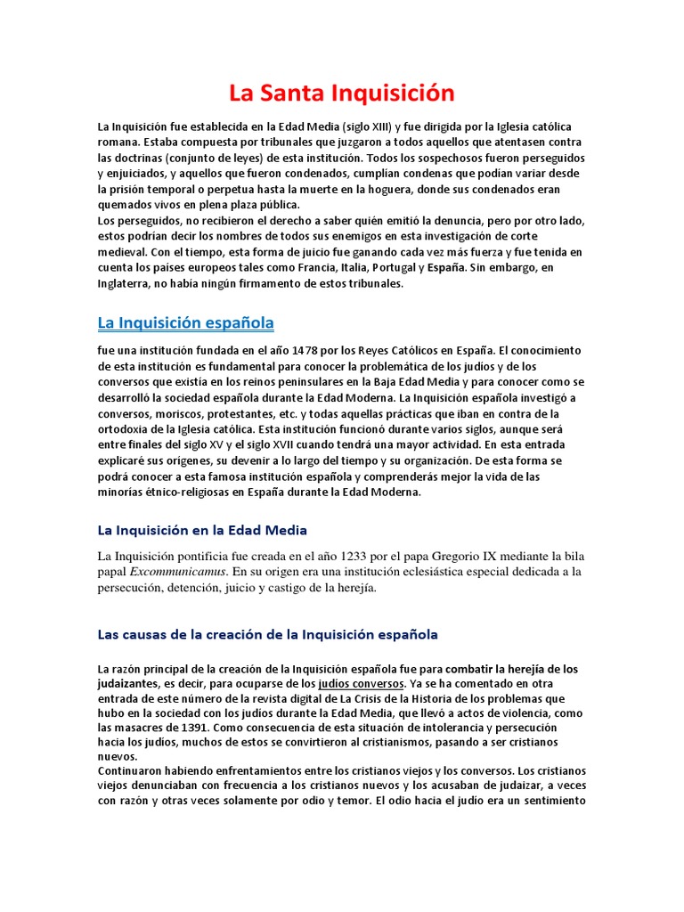 La Inquisición fue establecida en la Edad Media (siglo XIII) y fue dirigida por la Iglesia católica