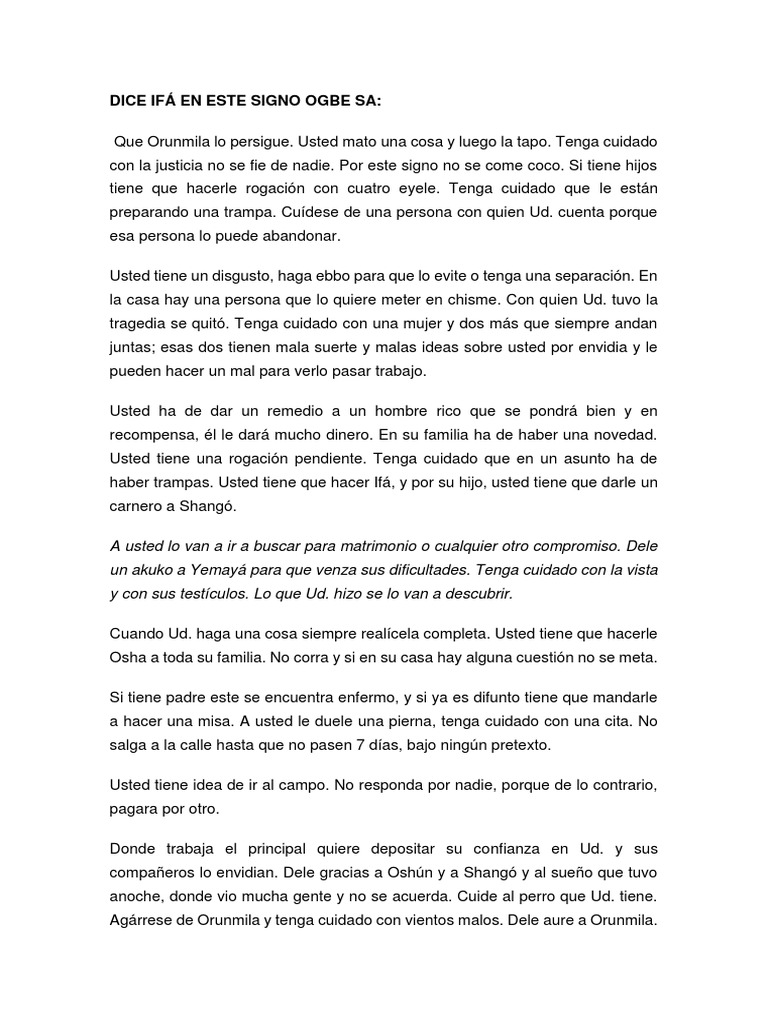 DICE IFÁ EN ESTE SIGNO OGBE SA: