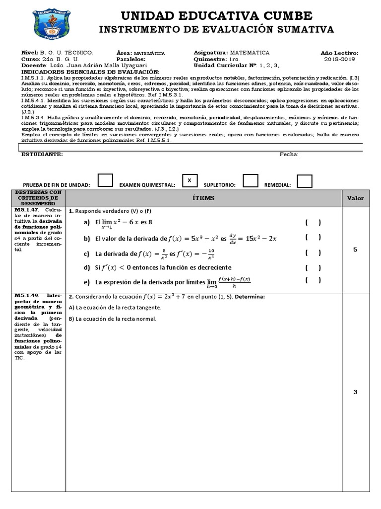 PRUEBA DE FIN DE UNIDAD: EXAMEN QUIMESTRAL: SUPLETORIO: REMEDIAL: