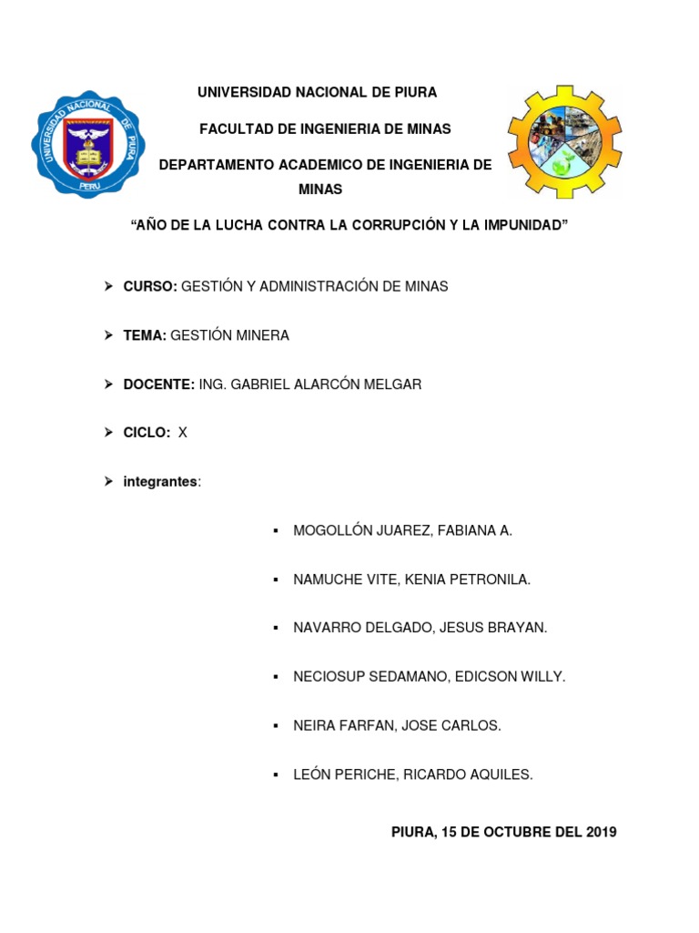 CURSO: GESTIÓN Y ADMINISTRACIÓN DE MINAS