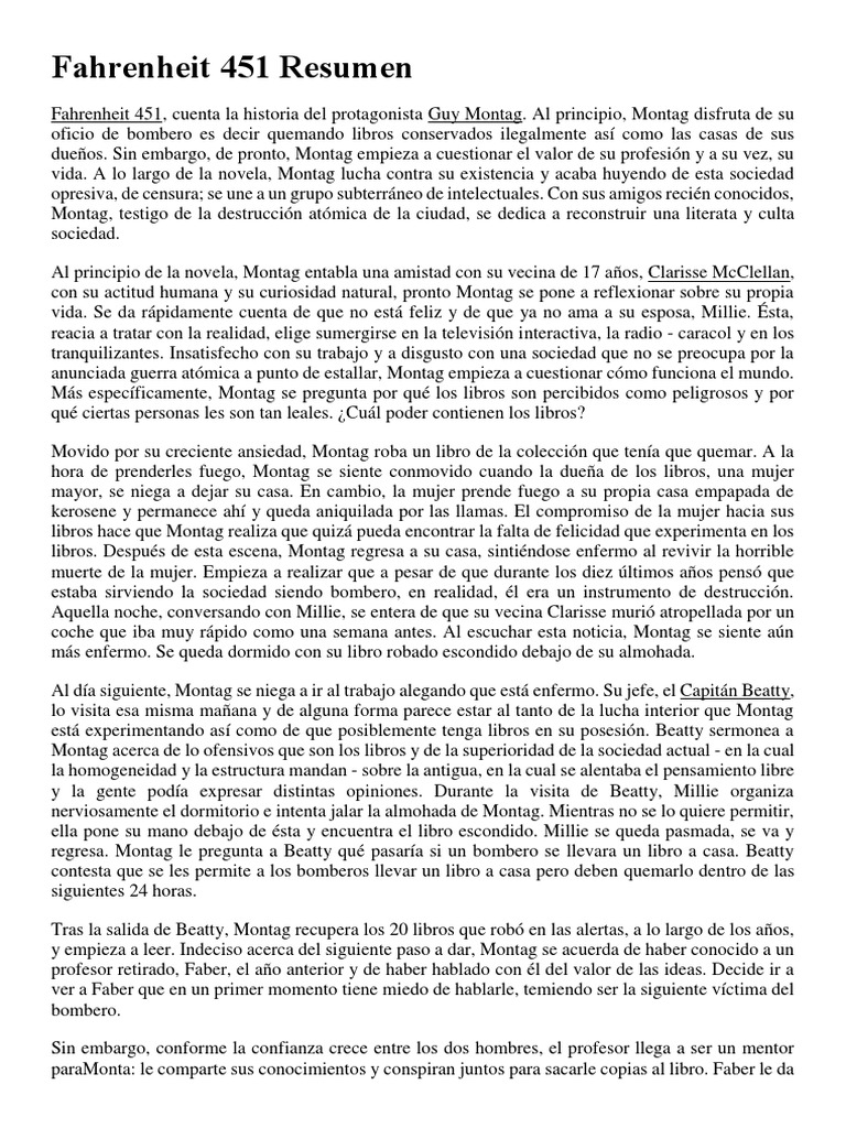 Fahrenheit 451, cuenta la historia del protagonista Guy Montag. Al principio, Montag disfruta de su