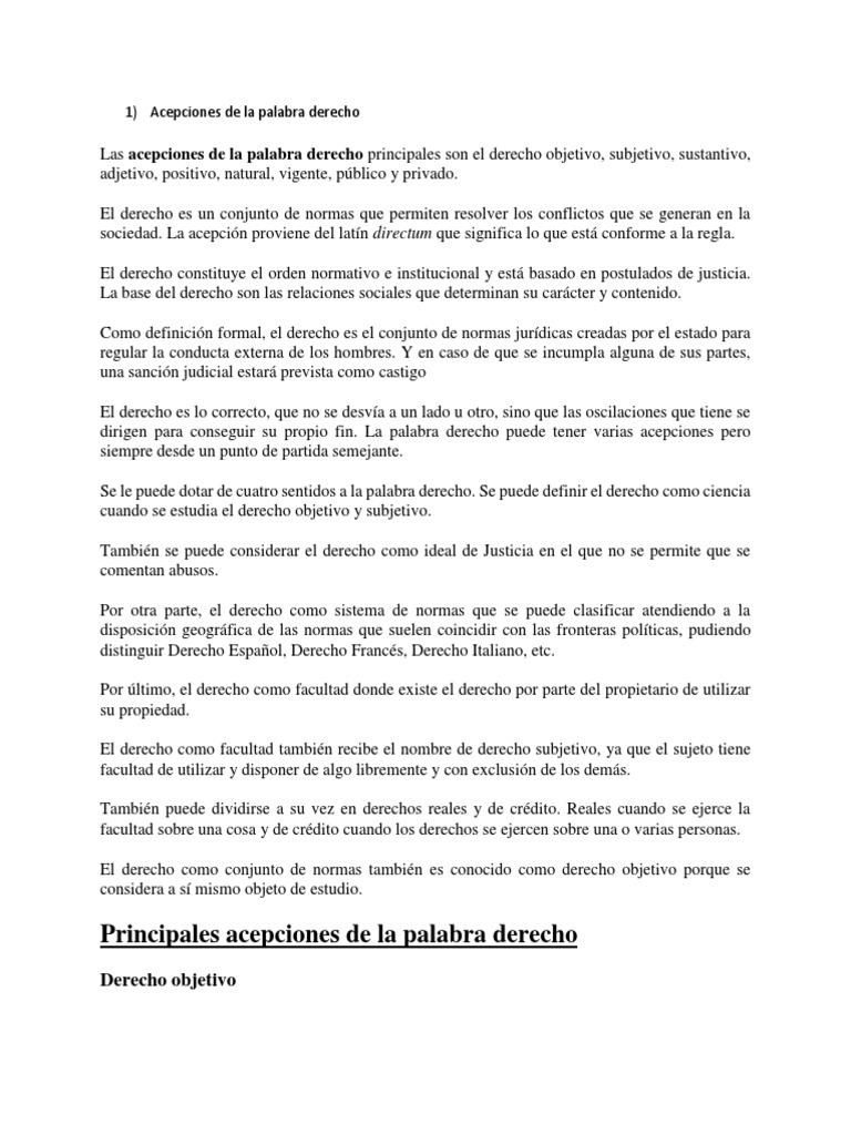 Las acepciones de la palabra derecho principales son el derecho objetivo, subjetivo, sustantivo,