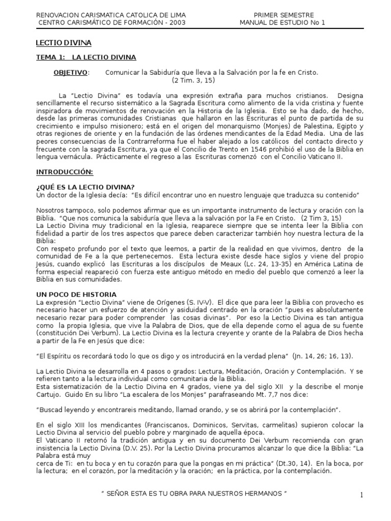 (constitución Dei Verbum). La Lectio Divina es la lectura creyente y orante de la Palabra de Dios hecha