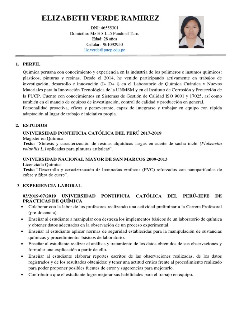 Química peruana con conocimiento y experiencia en la industria de los polímeros e insumos químicos: