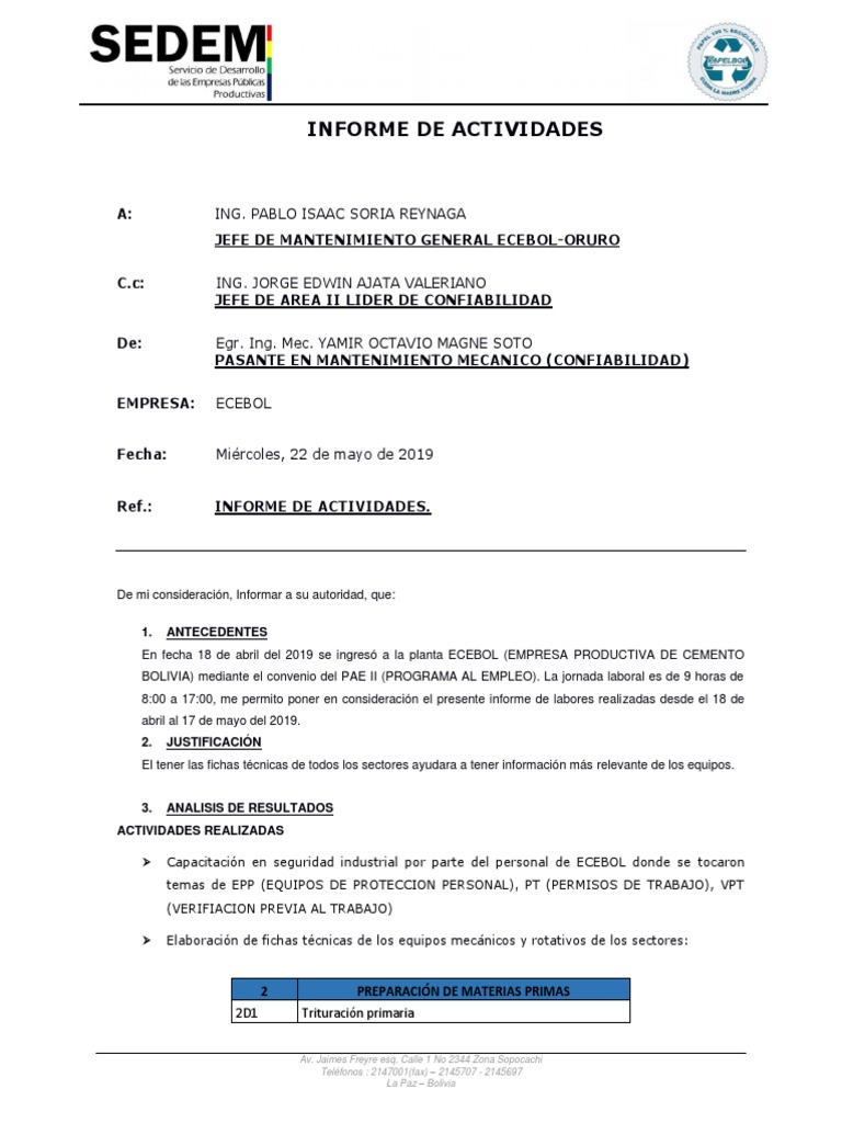 En fecha 18 de abril del 2019 se ingresó a la planta ECEBOL (EMPRESA PRODUCTIVA DE CEMENTO