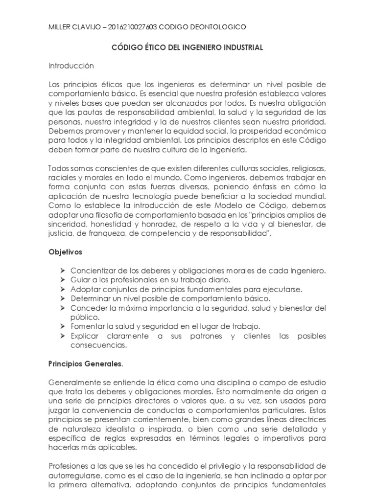 MILLER CLAVIJO – 2016210027603 CODIGO DEONTOLOGICO
