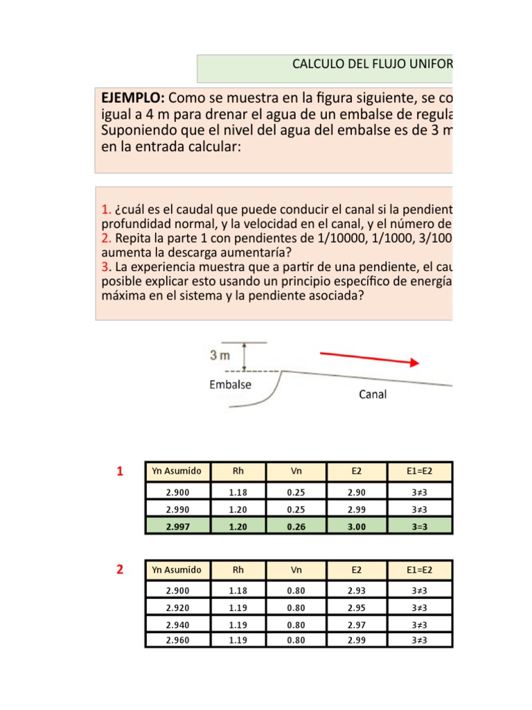 profundidad normal, y la velocidad en el canal, y el número de Froude)