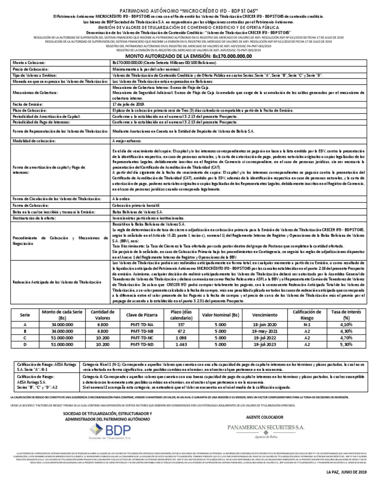 RESULTADO. LA DOCUMENTACIÓN RELACIONADA CON LA PRESENTE EMISIÓN ES DE CARÁCTER PÚBLICO Y SE ENCUENTRA DISPONIBLE PARA EL PÚBLICO EN GENERAL EN LA AUTORIDAD DE SUPERVISIÓN DEL SISTEMA FINANCIERO, LA BOLSA BOLIVIANA DE VALORES S.A., BDP SOCIEDAD DE TITULARIZACIÓN S.A. Y PANAMERICAN SECURITIES S.A. AGENCIA DE BOLSA.