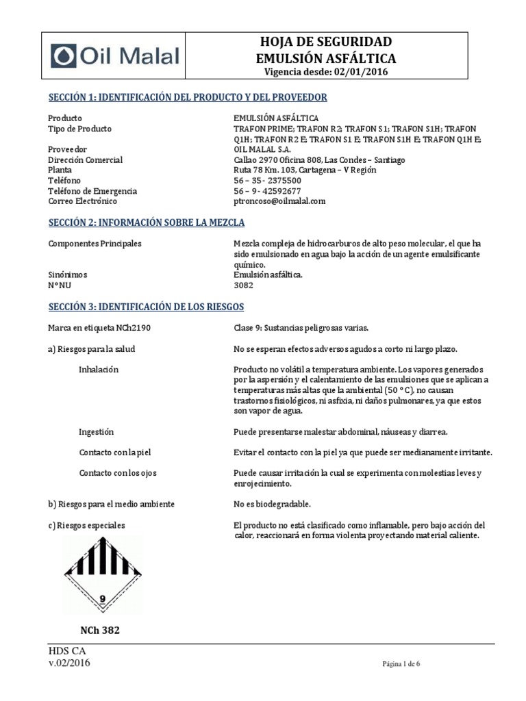 Incompatibilidad Evite el contacto de la emulsión asfáltica con otros líquidos o agentes