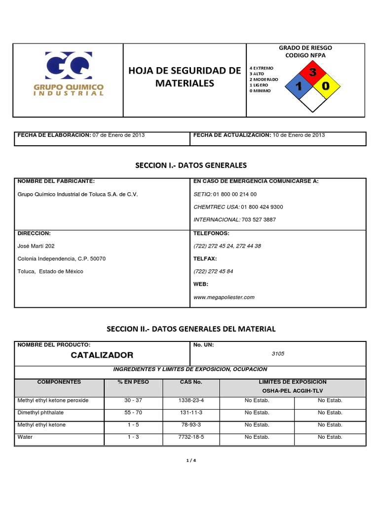Grupo Químico Industrial de Toluca S.A. de C.V. SETIQ: 01 800 00 214 00