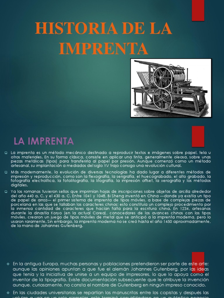 La imprenta es un método mecánico destinado a reproducir textos e imágenes sobre papel, tela u