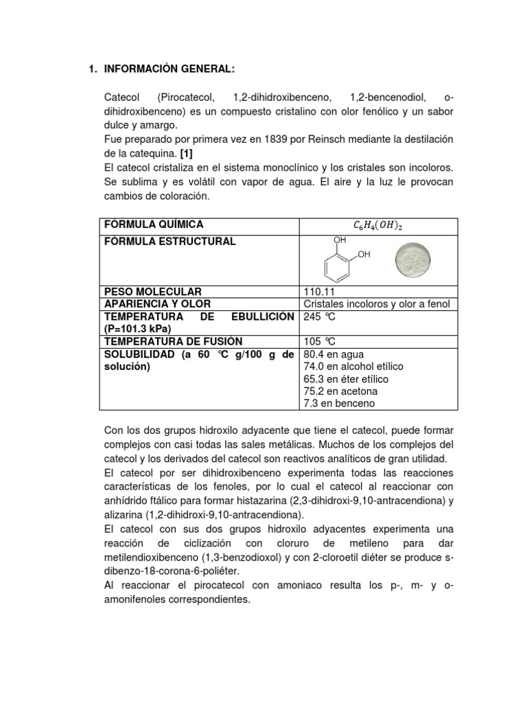dihidroxibenceno) es un compuesto cristalino con olor fenólico y un sabor