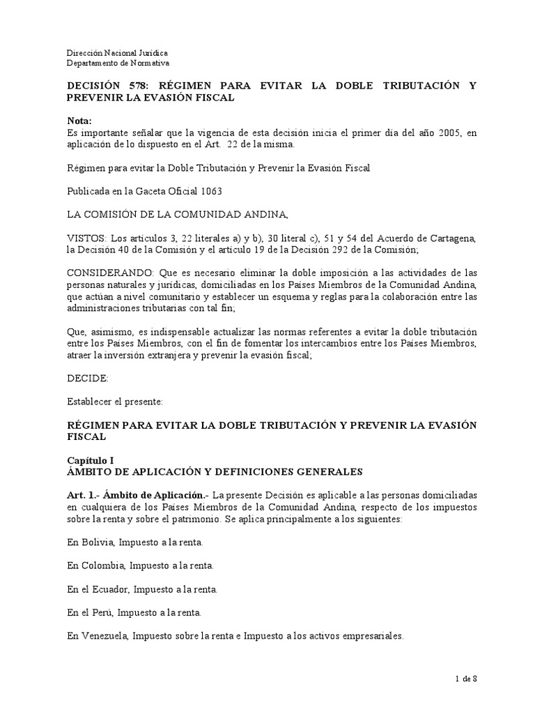 DECISIÓN 578: RÉGIMEN PARA EVITAR LA DOBLE TRIBUTACIÓN Y