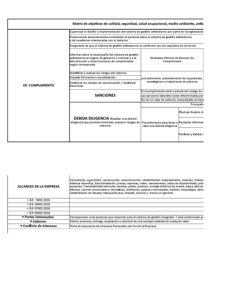 Matriz de objetivos de calidad, seguridad, salud ocupacional, medio ambiente, antisoborno, empresa segura y