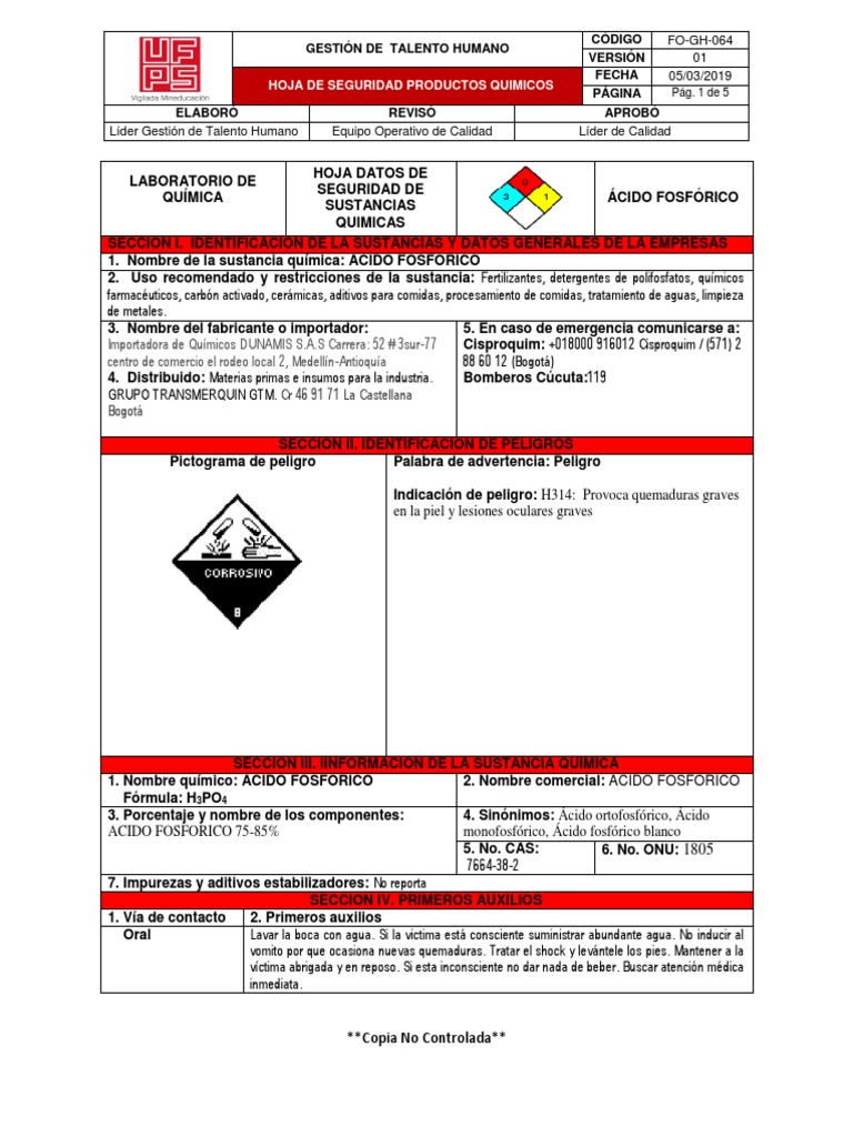 1. Nombre de la sustancia química: ÁCIDO FOSFÓRICO