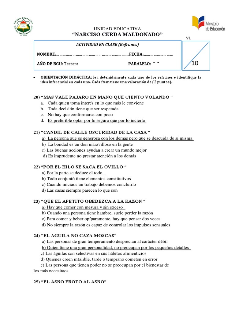 ORIENTACIÓN DIDÁCTICA: lea detenidamente cada uno de los refranes e identifique la