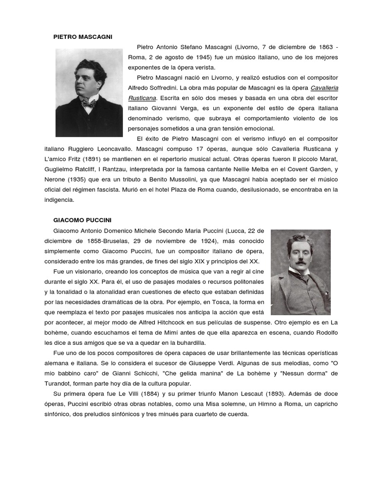 italiano Ruggiero Leoncavallo. Mascagni compuso 17 óperas, aunque sólo Cavalleria Rusticana y