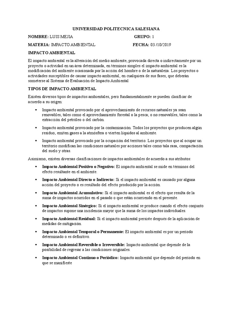 proyecto o actividad en un área determinada, en términos simples el impacto ambiental es la