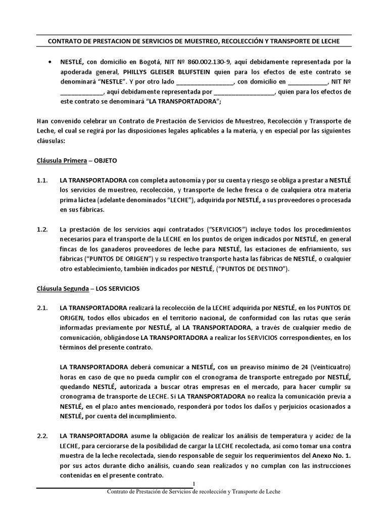 Contrato de Prestación de Servicios de recolección y Transporte de Leche