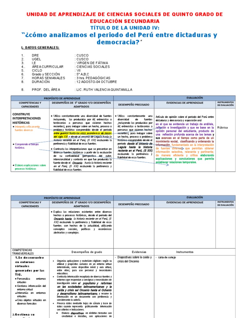 UNIDAD DE APRENDIZAJE DE CIENCIAS SOCIALES DE QUINTO GRADO DE