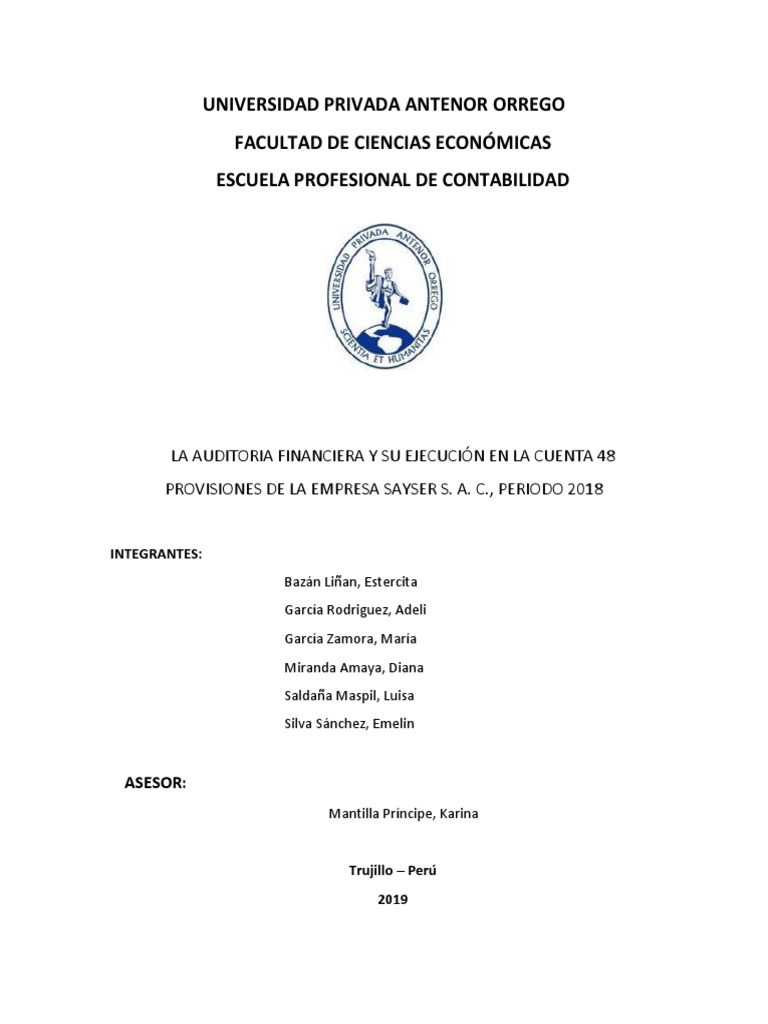 Presentar el informe de auditoría de la cuenta provisiones de la empresa SAYSER