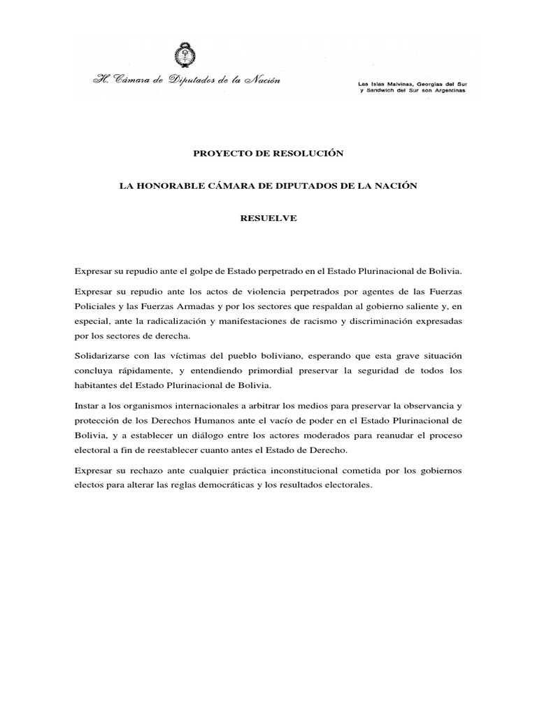 Expresar su repudio ante el golpe de Estado perpetrado en el Estado Plurinacional de Bolivia.