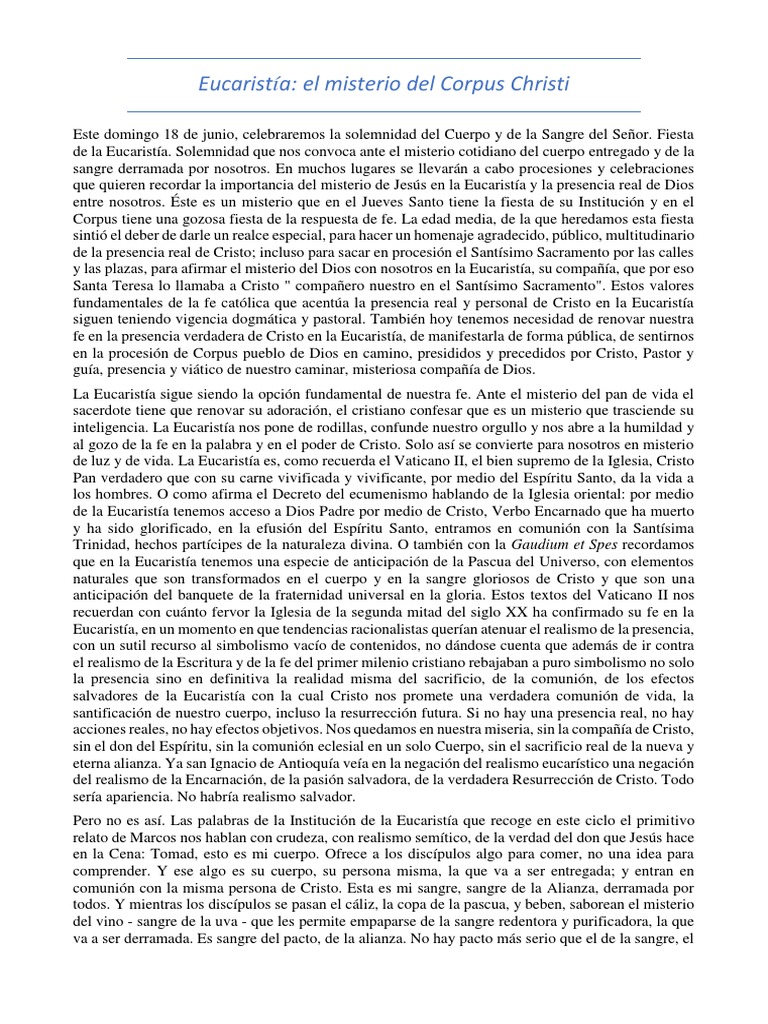 Este domingo 18 de junio, celebraremos la solemnidad del Cuerpo y de la Sangre del Señor. Fiesta