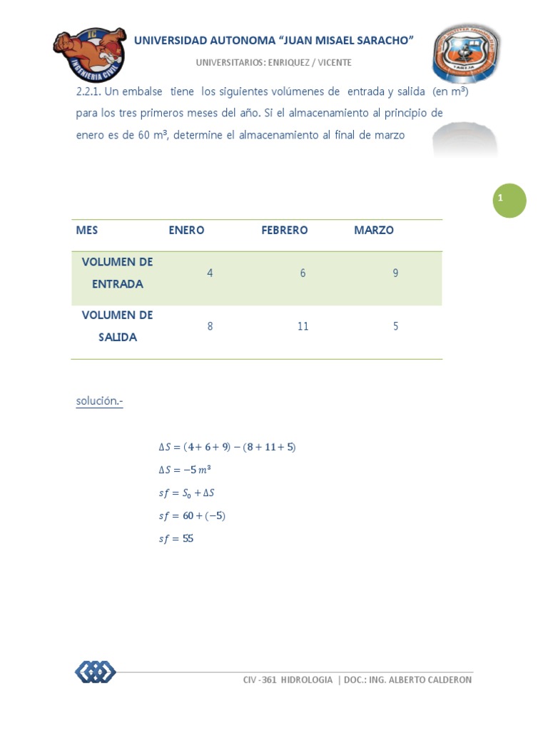 2.2.1. Un embalse tiene los siguientes volúmenes de entrada y salida (en m3)