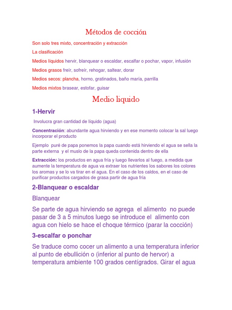 Medios líquidos hervir, blanquear o escaldar, escalfar o pochar, vapor, infusión