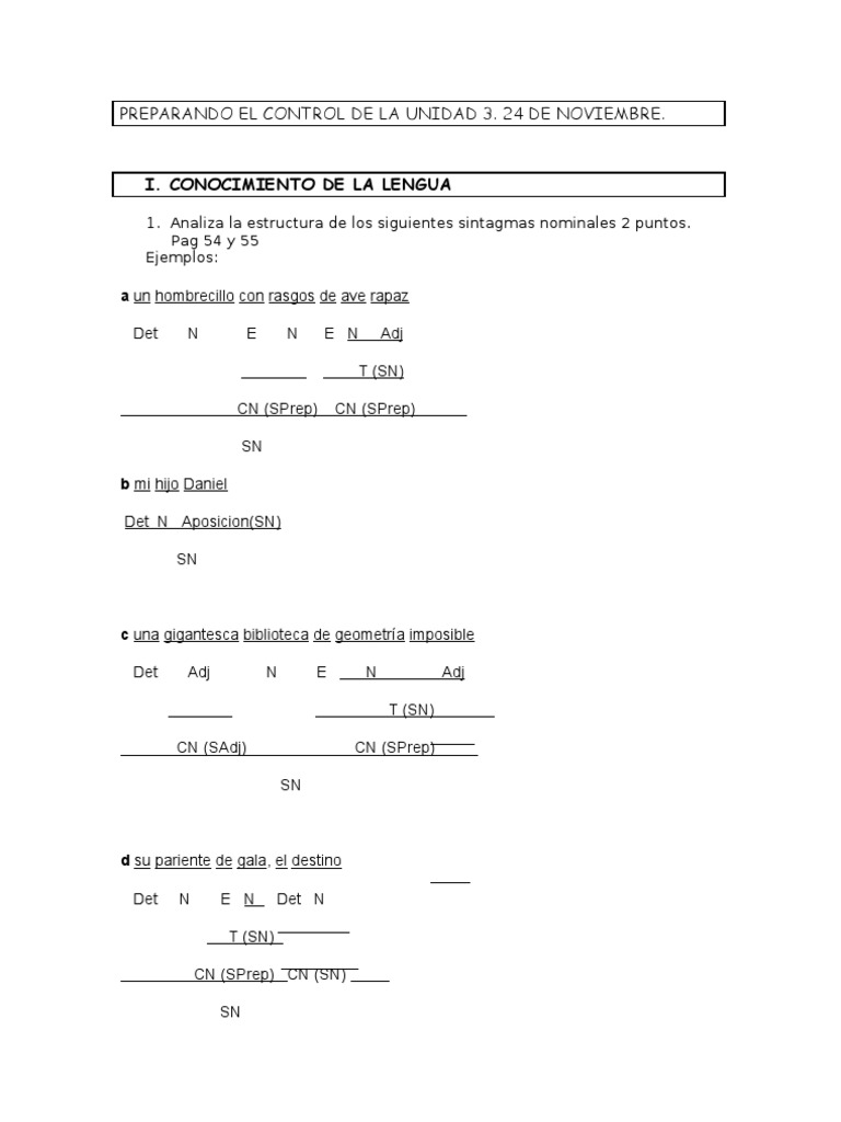 1. Analiza la estructura de los siguientes sintagmas nominales 2 puntos.