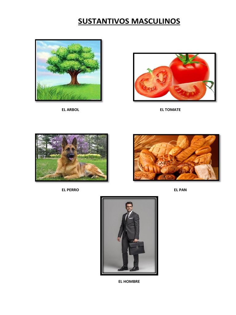 La lista incluye sustantivos masculinos como el árbol, el tomate, el perro y el pan, así como sustantivos femeninos como la isla, la roca, la televisión y la universidad. Los sustantivos se dividen en dos categorías de género gramatical.
