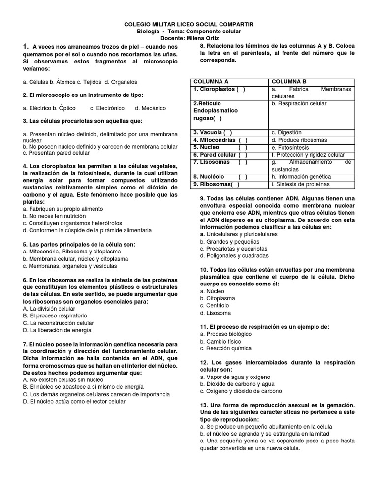 a. Células b. Átomos c. Tejidos d. Organelos COLUMNA A COLUMNA B