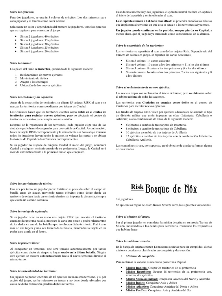 Si son 6 jugadores: 20 ejércitos Los territorios se repartirán al azar usando las tarjetas Risk. Dependiendo del