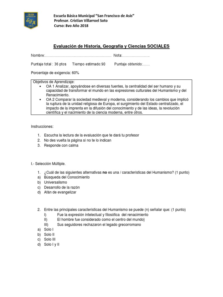 Evaluación de Historia, Geografía y Ciencias SOCIALES