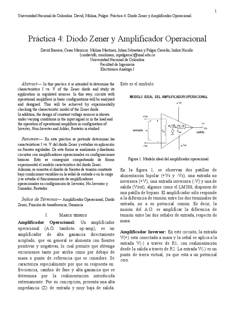 Universidad Nacional de Colombia. David, Molina, Pulgar. Práctica 4: Diodo Zener y Amplificador Operacional