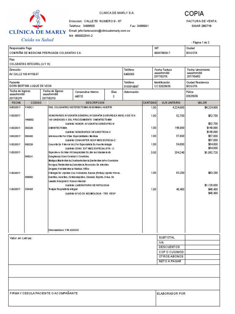 clínica de marly s.a. en la fecha de vencimiento el valor de los servicios aqui aqui descritos los cuales fueron recibidos a entera satisfaccion cualquier reclamo debe hacerse