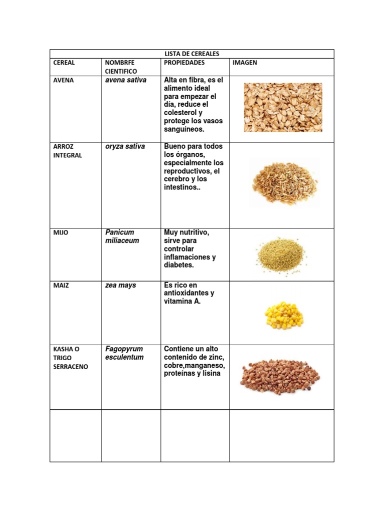 CEREAL NOMBRFE PROPIEDADES IMAGEN