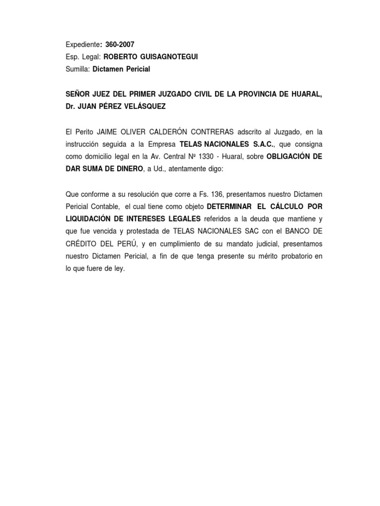 El examen pericial está dirigido a determinar los intereses legales calculados a