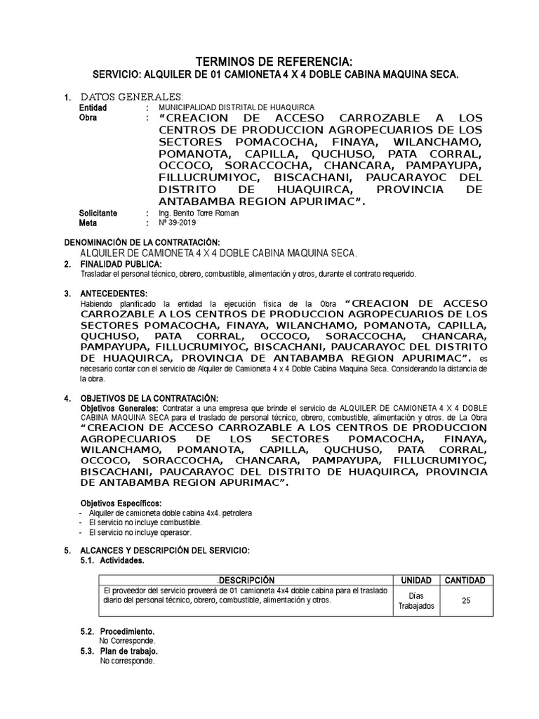 El servicio se realizara en el Distrito de Huaquirca, Provincia de Antabamba, Región Apurímac, en el proyecto
