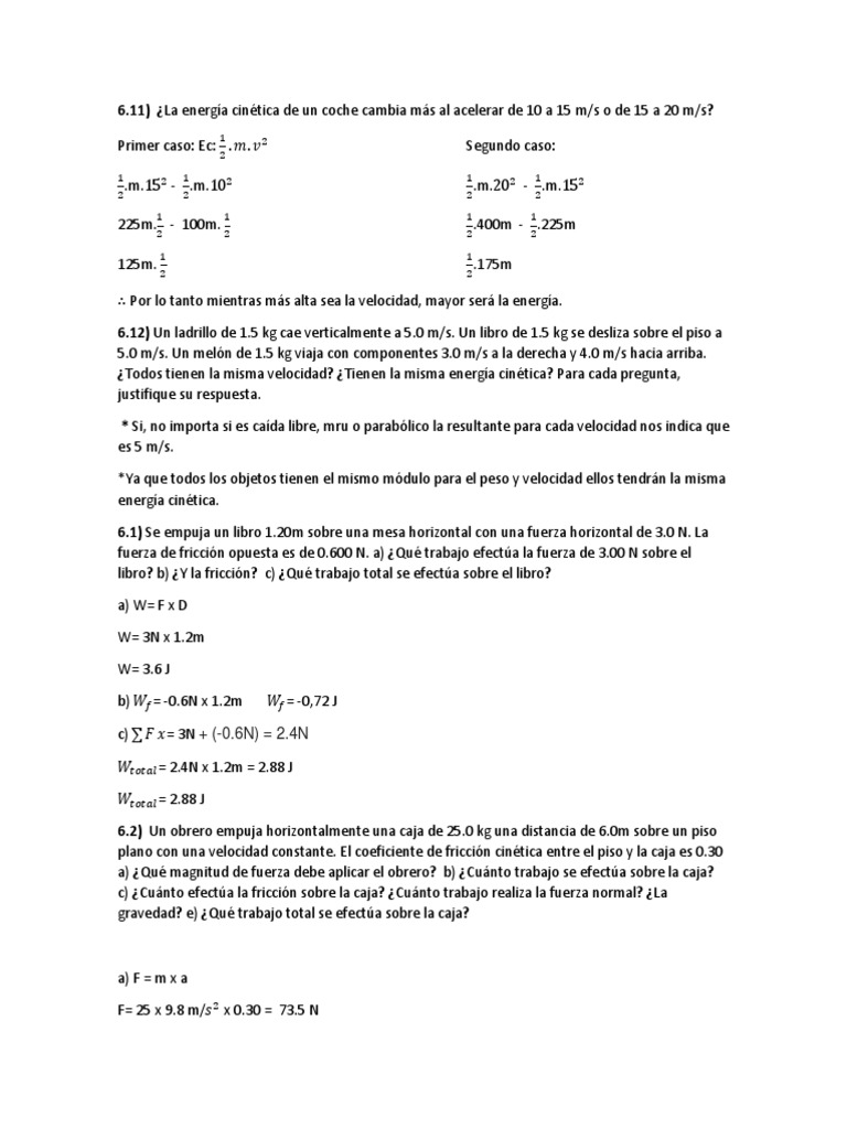 6.11) ¿La energía cinética de un coche cambia más al acelerar de 10 a 15 m/s o de 15 a 20 m/s?