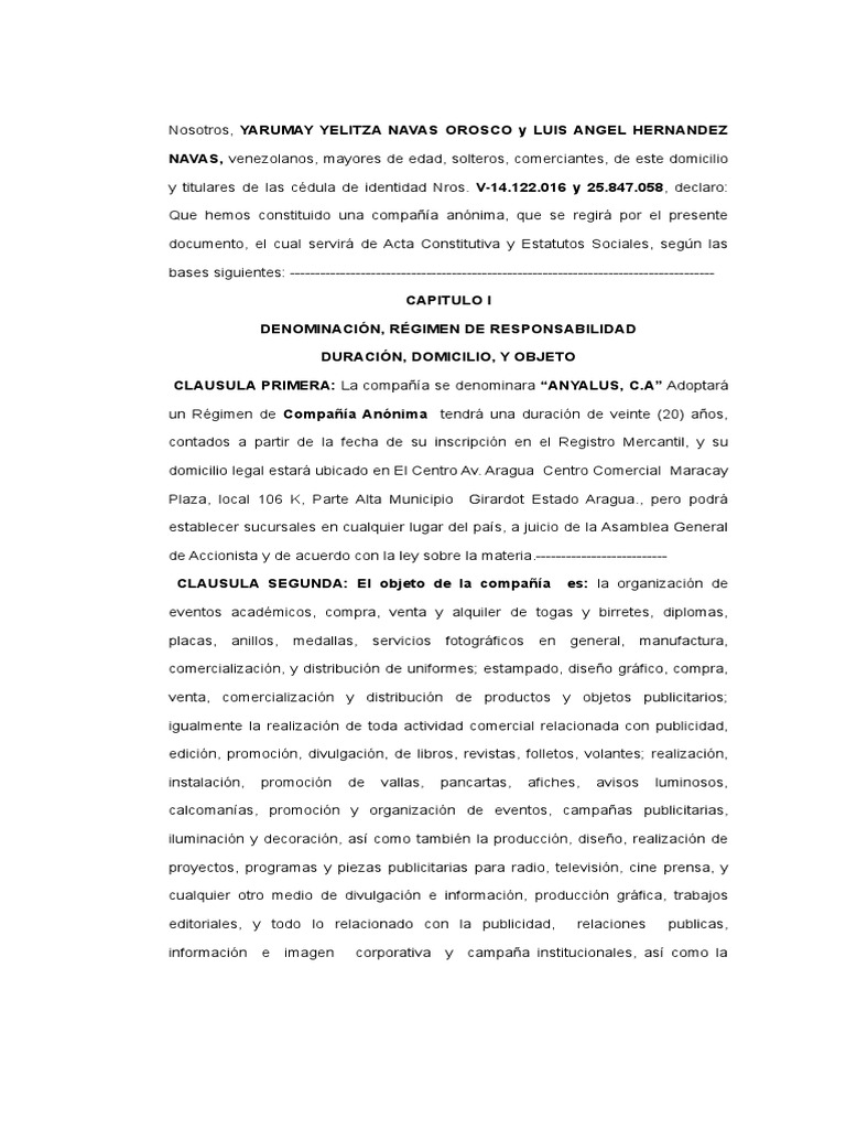 CLAUSULA PRIMERA: La compañía se denominara “ANYALUS, C.A” Adoptará