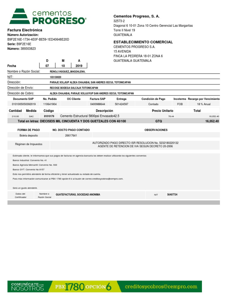 Total en letras: DIECISEIS MIL CINCUENTA Y DOS QUETZALES CON 40/100 GTQ 16,052.40