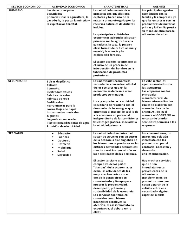SECTOR ECONOMICO ACTIVIDAD ECONOMICA CARACTERISTICAS AGENTES